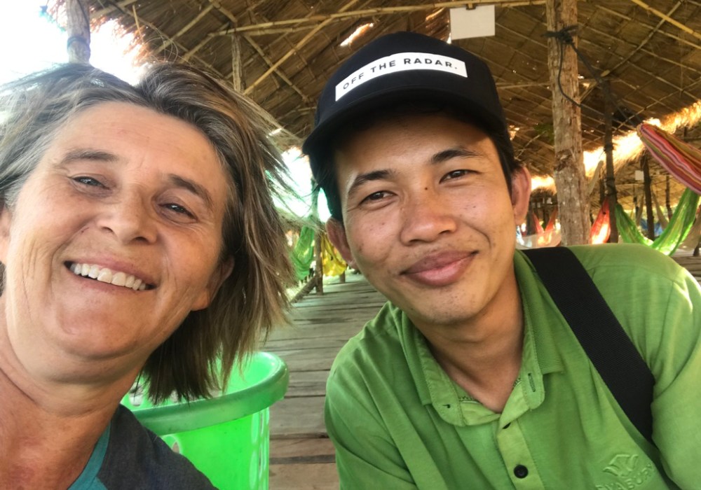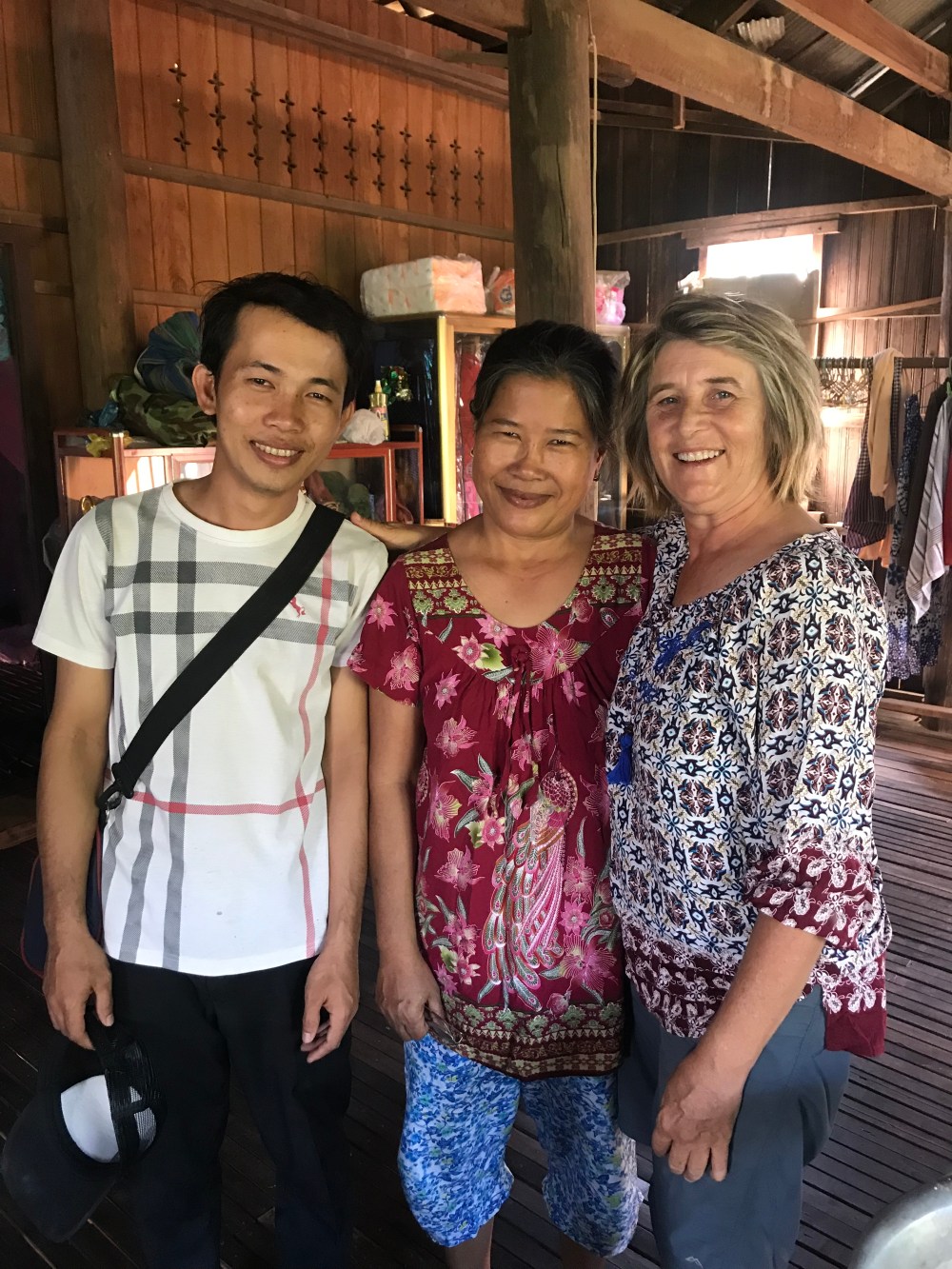 It was time to leave Stung Trent and I was still hoping for a chance to spend some time with a local family but every time I enquired there was some sort of hidden agenda, cost, only groups or even tours that benefit the company rather than the people whom we visit.  However by chance whilst exploring the different options I did come across a home stay on the Island of Kaoh Trong, across the river from the town of Kratie. I made contact with a young man Vireak and he offered me a few nights to stay with his family.  I had no idea what to expect other than meeting him at the boat ramp.  When I eventually arrived at the rivers edge I looked down to where I had to board the boat, my aching body cried. There was no way I was going to navigate the 50 steps down with two packs and a dodgy foot which was still not 100% and was causing other pain related issues in my lower back.  I was relieved when I heard “are you Virginia” let me help you take your bags.  Vireak so young looking for 29, he had a smile from ear to ear.  He explained to me how we will be travelling to his home.  “First by boat then you will be taken on a motor bike by my younger brother, over the sand dunes and to my family home.  I will leave you here on the boat as I have to go to work.  I will be back tonight and if you cannot understand or need help here is my phone number.” Next thing I am sitting in a boat with more water in it than out, the water pump completely useless, but we made the 15 minute journey across the Mekong to the island in one piece and my bags still dry.  Somehow we were able to ride up and through the sand dunes with the two of us and my load.  At times all I could do is just pray the bike would not flip as it plowed through the sand.  In my mind I was ready to jump.