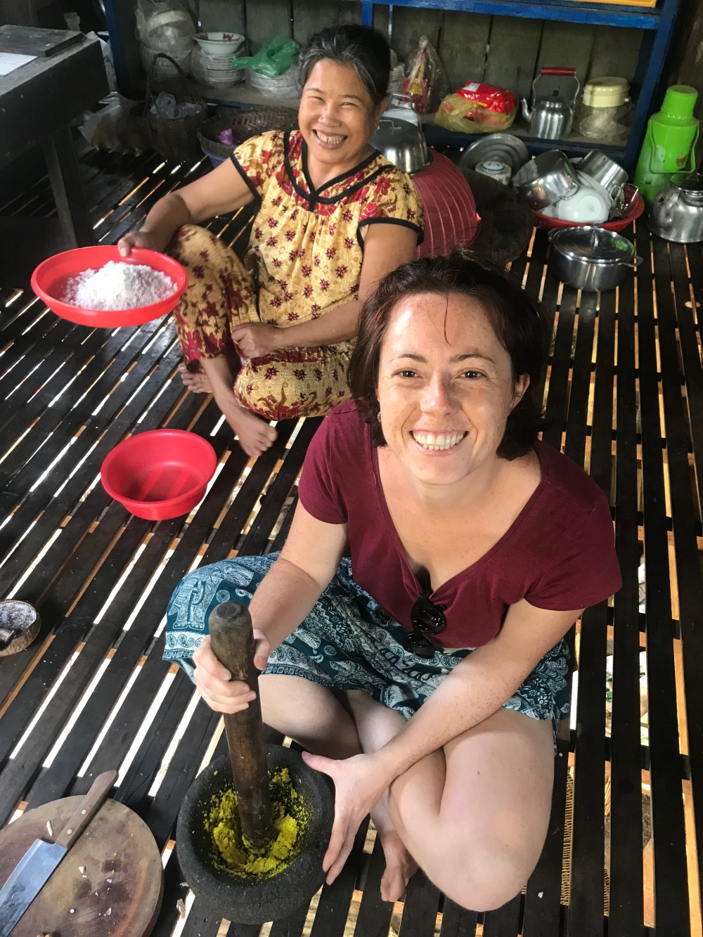 I could continue to write about the bike journey as we cycled at a slower pace along the river.  Riding past rickety homes held up by whimsy poles to protect the houses from the rising water when the river floods, old men repairing their equipment sitting under large trees and women crouched down lighting small coal fires in pots ready to cook dinner.  I could also write about the fisherman we met catching small fish by net as his wife drank a bottle of rice whiskey and danced a better version of my bogan dance.  Or the fun we had at the bar we went to, sipping a Mojito and listening to 1970’s hits like Bonney M.  This was all in a days work and more than I could learn ever from a text book, a newspaper, a documentary or a you tube video.